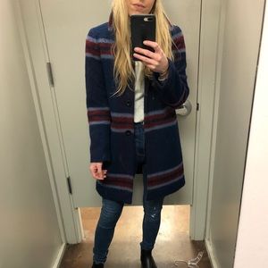 Calling all petite girls who struggle to find a fun wool coat 🙋🏼♀️ 30% Wool coat in lovely navy blue and red brushed plaid pattern making it look a bit like stripes. Classy meets festive. Size XXS petite. I am 5’1 and 108lbs for reference. Price is firm as this retails for more than double listing price.