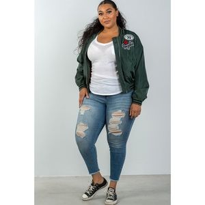 PLUS SIZE DARK GREEN PATCH BOMBER JACKET