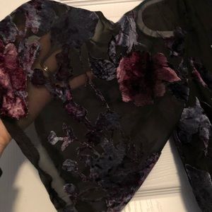 Super cute black romper with navy and violet velvet floral print. It has a black liner so not see-through where it matters. Large sleeves make the romper so chic. Perfect with high knee boots and a leather jacket for a GNO.
