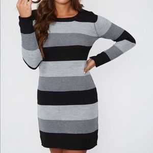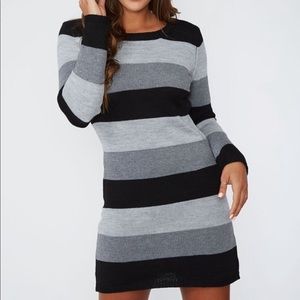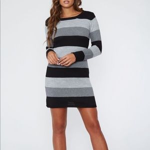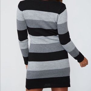 Black and gray long Sleeve Sweater Dress. Knit dress featuring wide stripes and long sleeves.