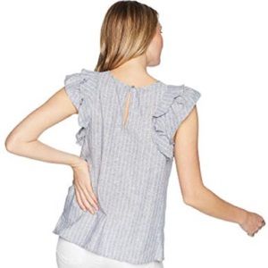 Brand new never been worn. Chambray color. Make sure you have this 1.STATE top on hand when the plans for the day include a laid-back brunch on the patio. Linen-blend top boasts a vertical stripe detail. Double ruffle detail at the cuffs. Round neckline. Sleeveless design. Keyhole with button closure at nape. Straight hemline with split side seams. 55% linen, 45% cotton. Machine wash and tumble dry. Imported. Comes from pet/smoke free home.