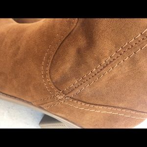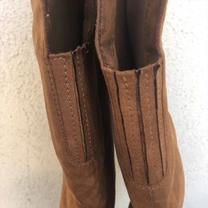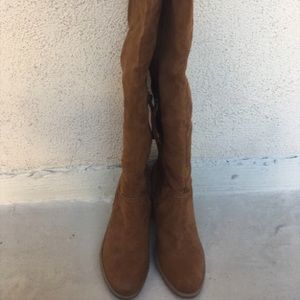 Tan Faux Suede Over the knee boots. Gently worn. Stitching detail along the front and back, including a convenient zipper placed on the inner side of the tall boot. Perfect for chilly nights out for a stroll. “These boots were made for walking.... And that’s just what they’ll do!”