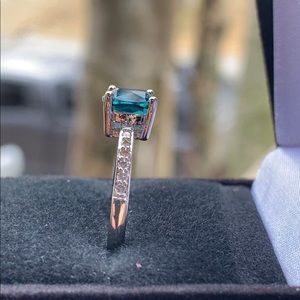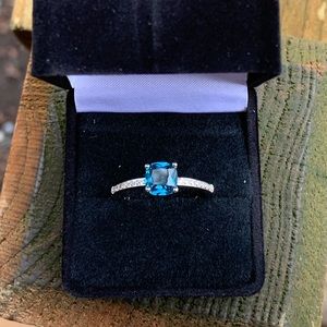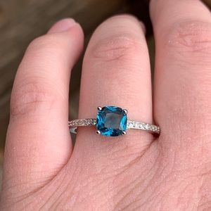 STAMPED CUSHION CUT BLUE TOPAZ ZIRCON WITH CLEAR ZIRCONS DOWN EACH SHOULDER THE RICH COLOR IS VERY PLEASING TO THE EYE! SET IN STAMPED 925 STERLING SILVER PLZ SEE ALL PICS AS THEY'RE A HUGE PART OF THE DESCRIPTION