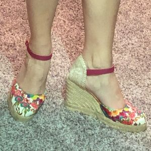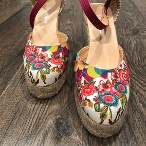 Floral Desigual espadrilles, size 39 European. Pink ankle strap with rope wedge bottom. Never worn — beautifully vibrant and very comfortable. If summer were a shoe, it would be these. 💞