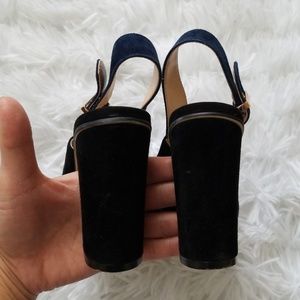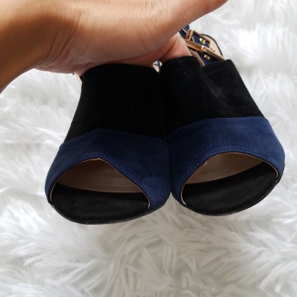 Dark blue and black suede heel. Peep toe. Gold tone buckle detail. Very light signs of wear throughout.
