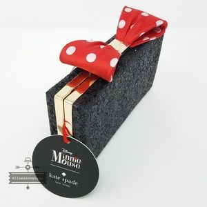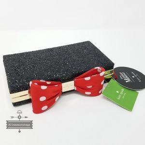 covered with chunky glitter and decorated with an unmistakable minnie mouse bow, this frame clutch (which also features an hidden snake chain) is the perfect way to add a bit of whimsy to your little black dress.