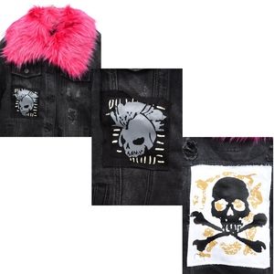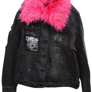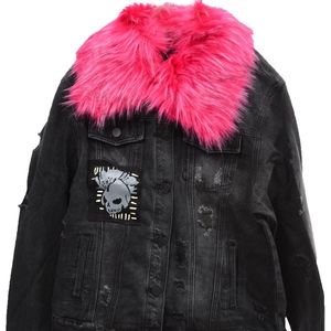 ~Denim is in! Check out this cool new denim jacket featuring a trendy skull patchwork design on front & back with destroyed denim details throughout. Button up front with pockets & distressed comes with a fun, removable, extra furry animal friendly co