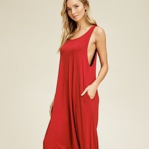 A knit round neck one piece jumpsuit featuring sleeveless, harem, all-in-one, comfortable, a soft and snug knit material. Would make a great cover up! Also available in green.