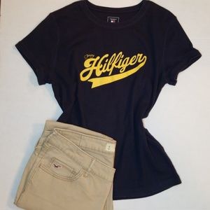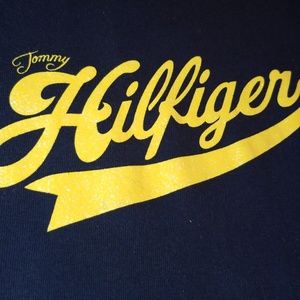 Tommy Hilfiger crew neck T-shirt. Nice cotton navy blue shirt with Tommy Hilfiger in glittery yellow. Size L. Bust 18", length from shoulder to hem 23". Pre-loved. Pictures reflect condition. No flaws or defects .