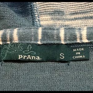 Prana V-Neck, Hooded Long Sleeve Striped Top/Summer Sweater in Sz Small. Colors of stripes are shades of blue and cream/off white. 25” Length from top of shoulder. 18” chest lying flat armpit to armpit. Sleeves 24” length from shoulder to bottom of sleeve. Large front center pocket. Ribbed at bottom. Lightweight summer top/sweater. 100% organic cotton. Gently worn. Good condition.