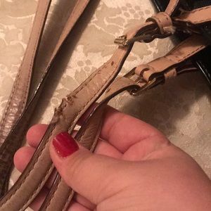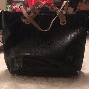 Black shiny purse with tan handles. Mild damage to one of the handles thanks to my dog. Sorry! Still in great condition!
