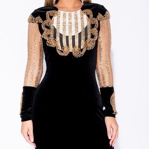 This velvet bodycon dress featuring bead trim with sheer sleeves is guaranteed to get heads turning.