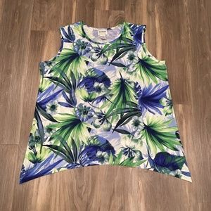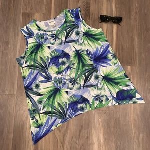 Lightweight and comfortable. Fun tropical inspired floral print in shades of blues and greens. Sleeveless Blouse. Flattering cut.
