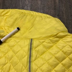 Lululemon what the fluff yellow pullover. Missing size tag but it is a 12. There is a mark on the back of the neck, hard to notice. I’m not sure if it will come out or not.