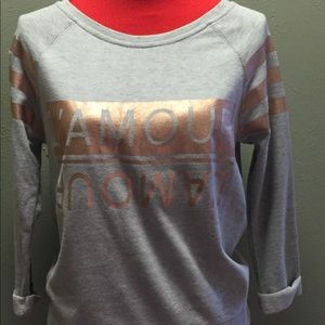 GRAY AND GOLD L’AMOUR SHIRT IS SUPER COMFORTABLE SIZE MEDIUM FRONT LENGTH 19”, PIT TO PIT 17”, SLEEVES 19.25”, BACK LENGTH 21.5”