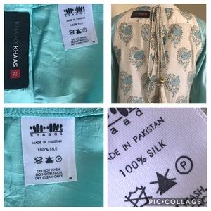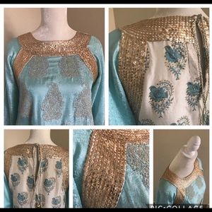 💯PURE SILK,khaadi khas pakistani brand,low high long air line shirt,high FRONT,with self printed,light blue embroidred zari motif,dull gold sequins lace on neck and shoulders,low BACK block printed pure silk, on motif small sequins work, striped border on back and front bottom of shirt.pure silk trouser, pure chiffon block printed sequend dupatta,,worn only once,no flaws