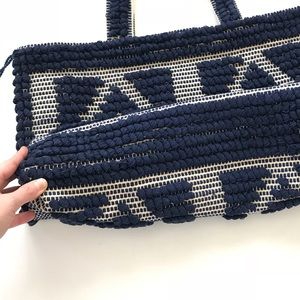 Clever Carriage Company Boho Embroidered Tote. Love the large knit detail with Pom Pom tassels on each side. Thick handles and ample interior space. This bag is heavy and very well made.