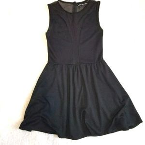 In gently used condition. A sheer winner for holiday season, this flirty and feminine For Love & Lemons dress turns this LBD upside down with chic mesh panels in front and back for dramatic first and last impressions. Crewneck, sleeveless Stretch, front and back mesh panels, concealed back zip