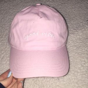 adjustable baby pink dad hat that says “good vibes” in white writing.