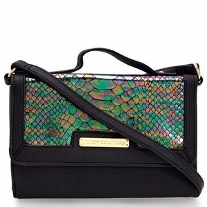 New with Tags, with a flap over section in front, clear ID card slot, credit card slots, zippered section, and cellphone or currency section