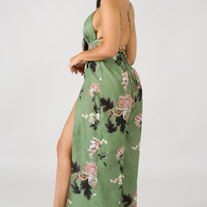 Womens Green Floral Print Double Slit Leg Jumpsuit