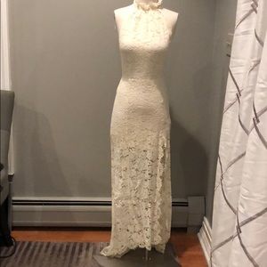 High-neck lace halter maxi dress with an open back and sweeping silhouette. Scalloped hem with a high asymmetrical slit and subtle train. Features mini lining and hidden back-zip closure; button closure at nape. By Jen’s Pirate Booty