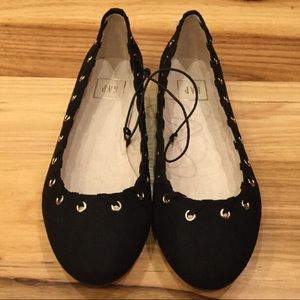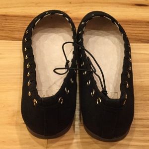 Women’s 8.5 Black Faux Suede Gold Flat Shoes