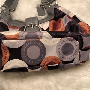 This bag is in great condition and has lots of organizing pockets to place things. All hardware in awesome shape. Colors include copper, grey, dark navy blue and white. Material is like a satin very soft.