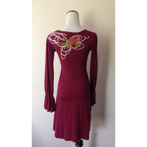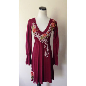 Soft cotton jersey is cut with a low v-neckline, smocked empire waist and bell sleeves. It's adorned with Johnny Was' signature elaborate embroidery- art nouveau vines and intricate roses. The color is 'sangria', a medium burgundy red. Skirt ends at or just above the knee. Unlined. 100% cotton, machine wash.
