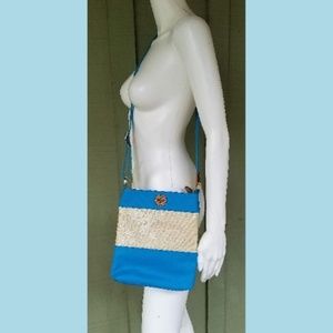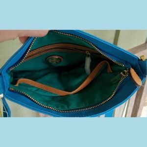 This is a lovely turquoise and cream coated canvas Pierson Swingpack Cross body bag from Tory Burch.