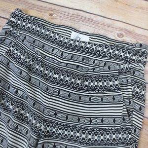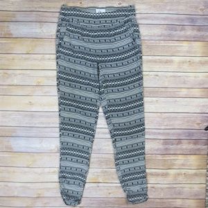 Black and white geo-stripe woven pants with elastic back waistband. Ruching around ankle cuff. Looser fit, jogger style. Excellent condition.