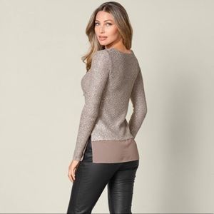 Perfect for a glam night out! Cut outs at the sides with sheer chiffon create an elegant, layered look for this scoop neck sequin sweater :)