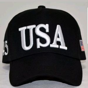 Black USA 45 with flag hat and bumper stickers