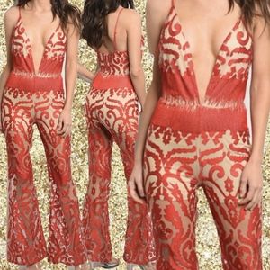 Beautiful red and nude jumpsuit with a deep v-neck plunging bust. Perfect for a special event or party when you need to look your best!