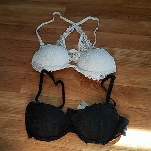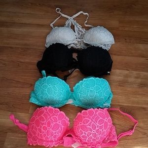All used condition size A 32 for all 4 bras give you a very sexy date night lift up w/ lace design very comfortable bra too small on me now! Open to offer no trades!!! Colors are hot pink ,black, mint green,white
