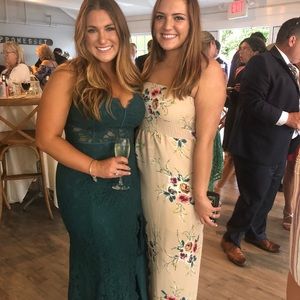Wore this 1 time to a wedding and it is a gorgeous low cut green maxi laced dress with spaghetti straps and a slit down the leg.