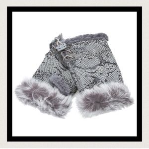 💜Super Soft & Furry Gray Fingerless Gloves💜 The accent fur feels like whispy and soft rabbit fur. Gray & Black Reptile Pattern and side cord ties adorned with fur on the ends.