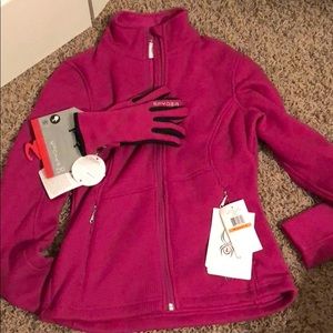 Never been worn!!! pink jacket with a fleece lining inside and matching pink and black gloves with the fleece lining inside
