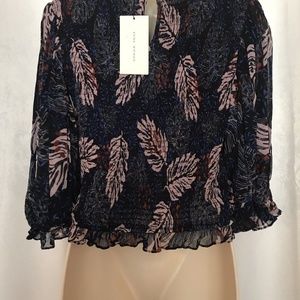 NEW Zara Feather Print Sheer Shirred Blouse Crop Top Shirt Balloon Sleeve