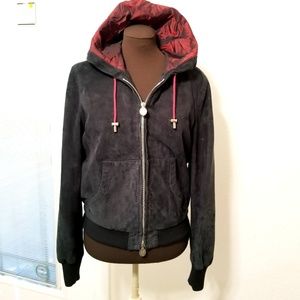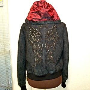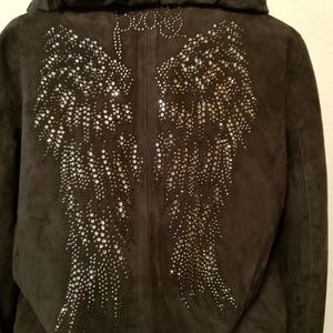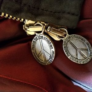 Stunning, Rare one of a kind Donald J. Pliner Jacket (Peace for the Children). Genuine Leather. Has angel wings on back. Angel wings have bling stones. 2 pockets in front with beautifully designed zipper that has peace symbol for Peace for the Children. Attached hoodie with gorgeous Maroon lining with Donald J. Pliner Signature in all interior lining. Seen in pic 8. Will accept reasonable offers. Pre-owned in excellent condition.