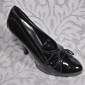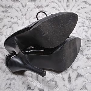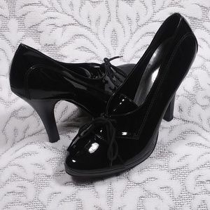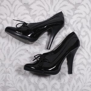 Sexy lace-up pumps in black patent leather. They have a 5" stiletto heel and 1/2" platform sole.