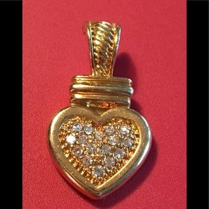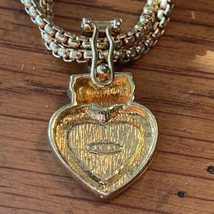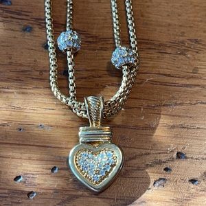 NPC24. Vintage Double Strand Gold Tone w/removable HEART pendant w/crystals/Rhinestones. 2 crystal/Rhinestone beads perfectly accent the heart! SHINES BEAUTIFULLY. I see no breaks in chains. Some scratches/marks. See no missing crystals, but pls allow if I’ve missed. Balls are covered w/crystals, heart has clustered crystals on front. W/O extender, is esti 15“ not incl clasp. Extender can add 3“. Unknown shiny metal. Marked NR. Seller said Avon, but don’t see a mark. SEE COMMENTS.