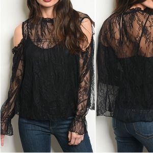 Black Lace Cold Shoulder Lace Top. Long sleeve high neck cold shoulder lace blouse. Black tank under neath is connected at the shoulder & firm fit with adjustable tank straps and Lace overlay is Super soft & Stretchy