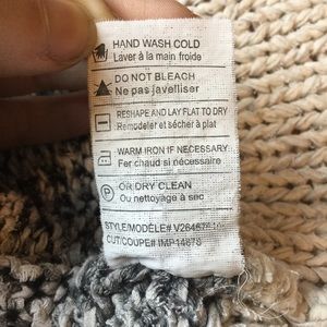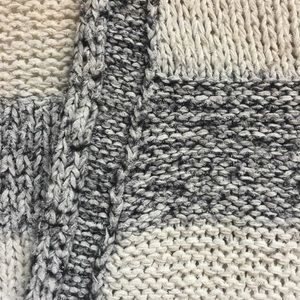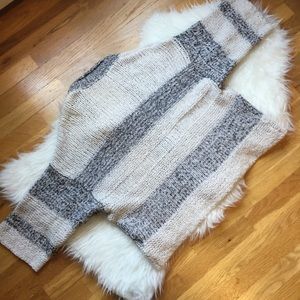 This textured, marled, knit cardigan is perfect for staying cozy in the winter. Dropped shoulders, 3/4 sleeves and open front that allows for drape and movement. White and gray/grey stripe. 77% cotton, 14% nylon and 9% wool. The only flaw is that the neckline tag is missing. However, the side tag on the left is still attached, showing size and confirming authenticity. Also has some minor pilling but otherwise in great condition.