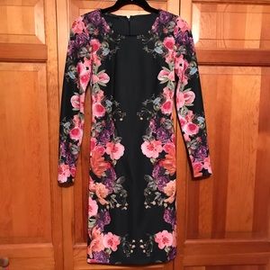 INC dark navy dress with floral designs on front and back
