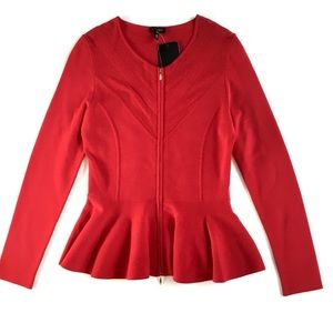 Pictures do not do this piece justice. The color is a beautiful bright red (looks a little more orange in pics), soft knit with exquisite details. New with no defects. Gold zipper with E emblem. Made in Slovenia. Fitted yet stretchy.