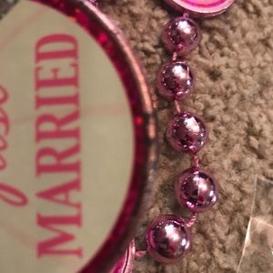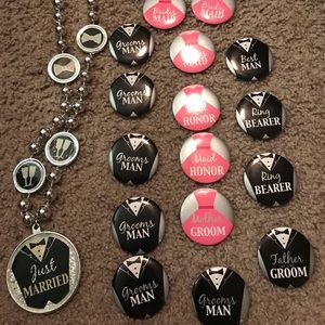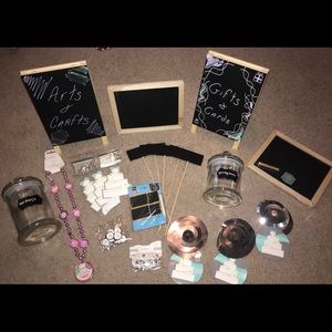 2 glass jars with chalk sticker, 2 lap boards (one with chalk), two standing chalk boards, 5 stick boards, 2 bead necklace (slightly wear n tear from storage), confetti, 12 Bell charms and engagement rings, 3 cake decorations, 3 hanging decorations ( bent from storage) 4 chalk board clips with chalk. Buttons for grooms n brides, etc