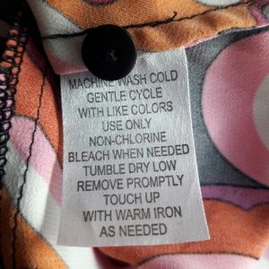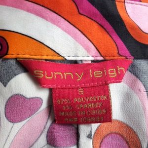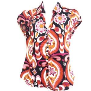 Sunny Leigh Top Button Front Hippie Psychedelic Groovy Bold Stretch. Black Button Front with Pointed Collar. Puffy Cap Sleeves. Pink Red Black Orange White. Machine Wash. Tagged size S.