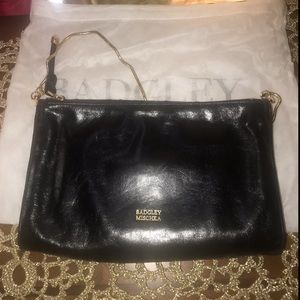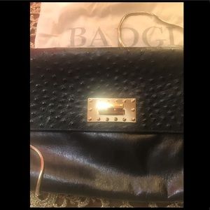 Black leather Badgley Mischka purse, gold chain, with dust bag.
