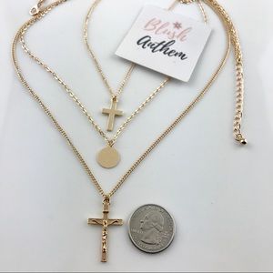 3 layer religious cross necklace. Shortest layer approx 16 inch plus 2 inch extender. Cross is 3/4 inch. Longest chain 22 inch. Cross is approximately 1 1/4 inch. Zinc alloy metal fashion jewelry. Gold tone.